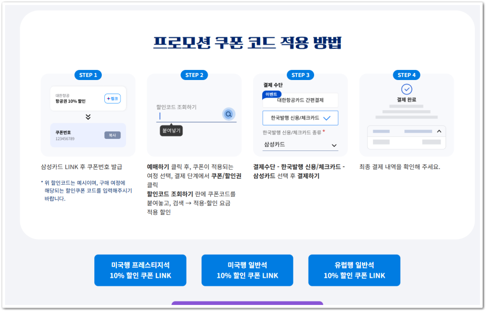 - 할인 조건 - 삼성카드 링크 후 대한항공 홈페이지/모바일에서 쿠폰 적용 및 삼성카드 신용카드로 결제시 10% 즉시 할인